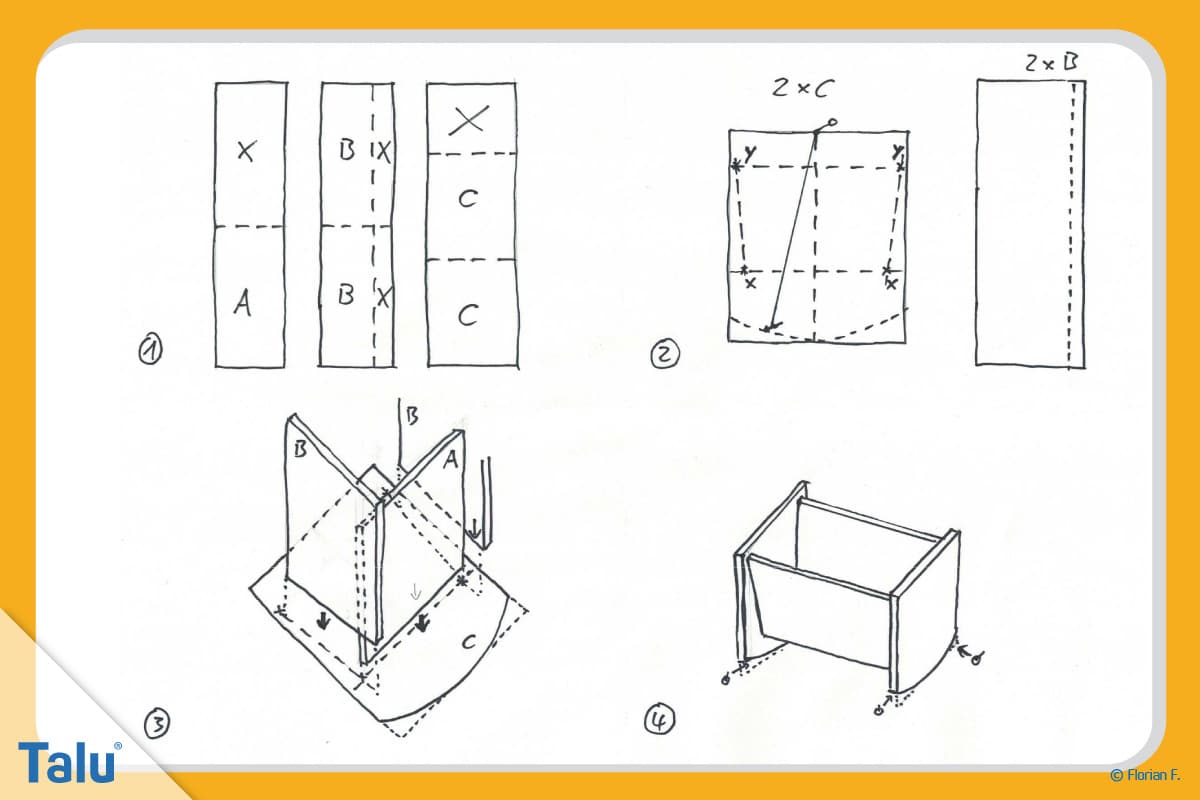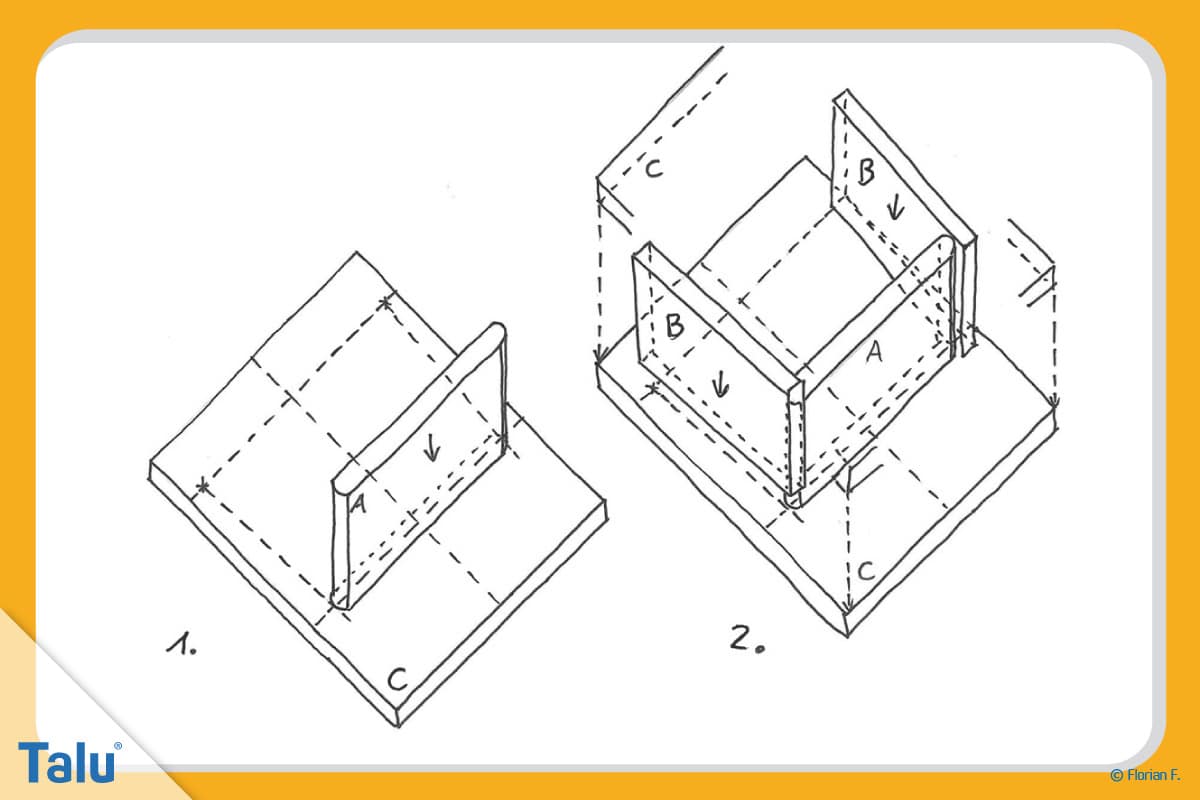 - Längsseiten von Bauteil A „Boden“ und jeweils eine Stirnseite der Bauteile B „Seiten“ mit Holzleim bestreichen