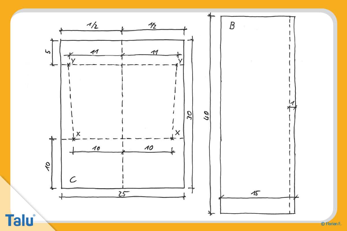 - jeweils Punkte „X“ und „Y“ auf gleicher Stirnseitenhälfte verbinden – ergibt Ansatzlinie „Seiten“ B