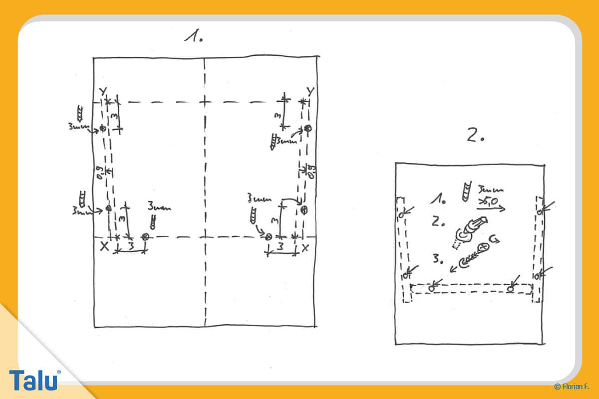 - markierte Punkte mit Holzbohrer 3 mm durchbohren, Löcher auf Außenseite (Rückseite von angezeichneten Linien!) mit Senker so tief einsenken, dass Köpfe der beschafften Schrauben darin verschwinden