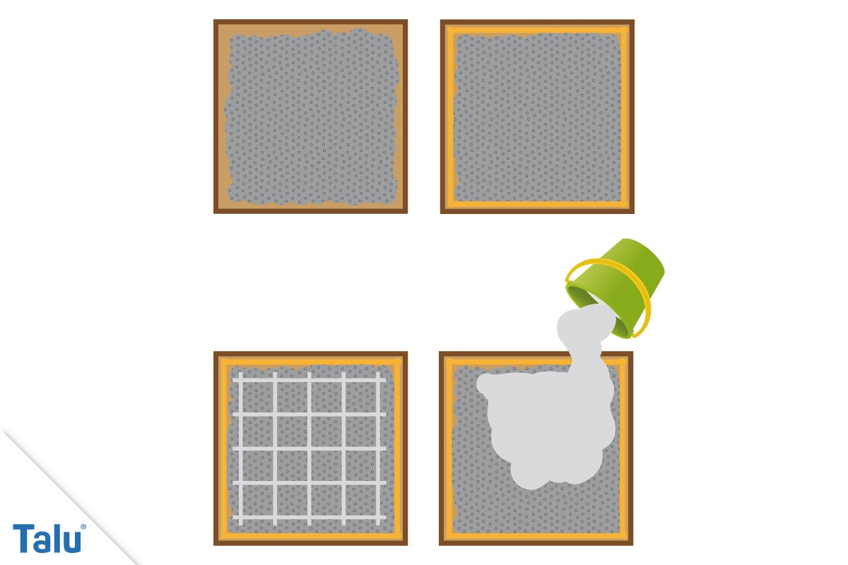 Der Boden wird mit Kies ausgelegt und glatt gezogen. Mit den vier Brettern wird das Fundament eingeschalt. Es genügt eine Bodenplatte von ca. 1 m² und 15 cm Dicke. Eine Baustahlmatte darf natürlich nicht fehlen. Die hohe Drucklast des Mauerwerks würde die Platte sonst schnell brechen lassen. Nachdem der Beton angerührt und eingegossen ist, wird er zwei Tage ruhen gelassen. Dann kann ausgeschalt werden und das Mauern kann beginnen.