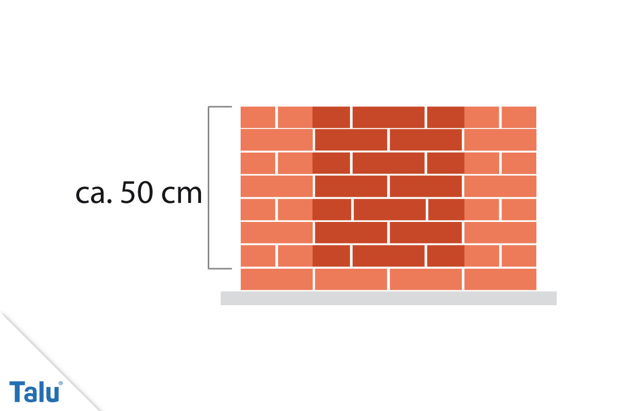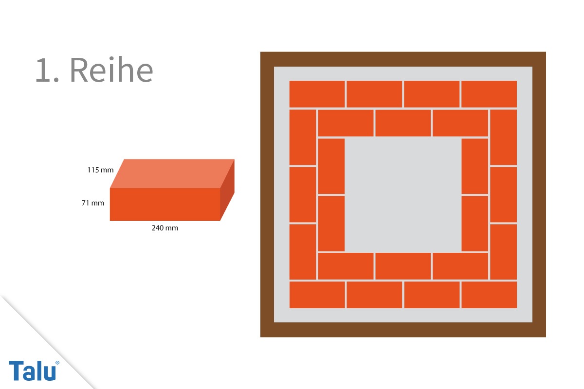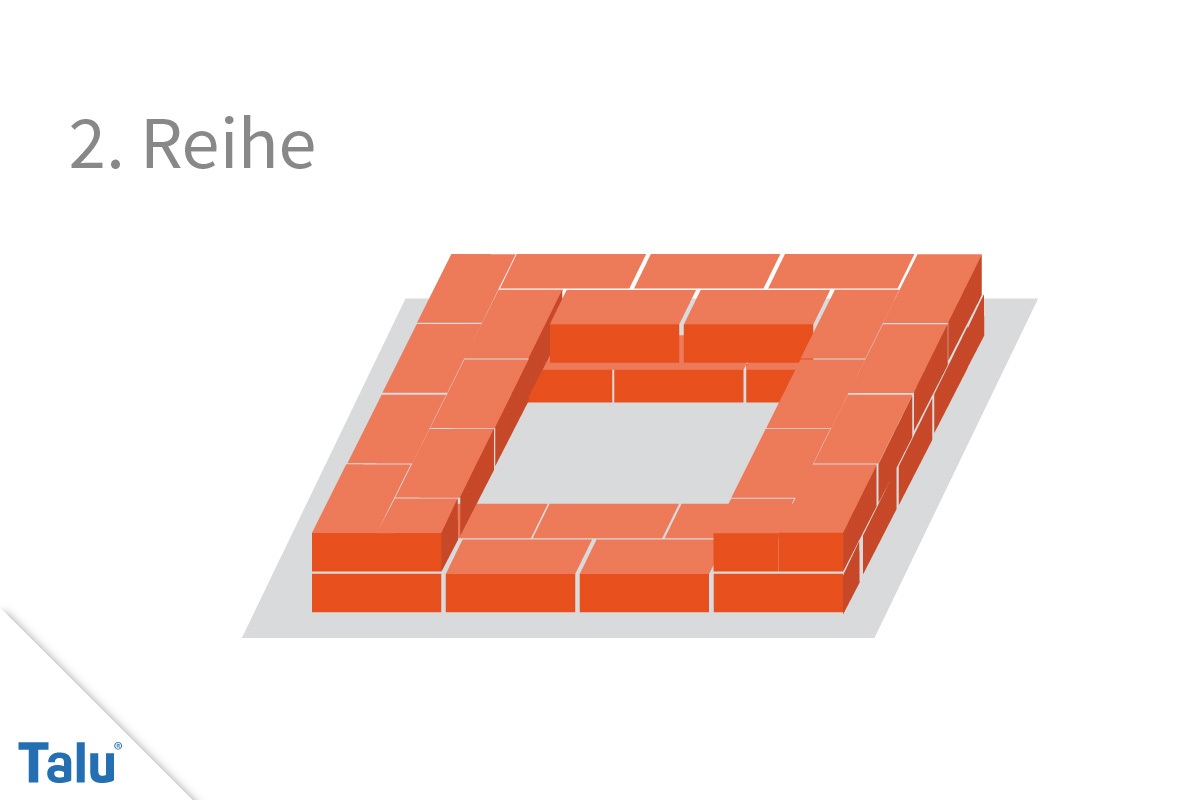 Eine praktische Grundform wird bereits mit 4 Steinlängen Breite und 3 Steinlängen Tiefe erreicht. Mauern Sie erst einen „Außenkreis“ und dann einen versetzten „Innenkreis“ – das ist die erste Reihe Steine.
