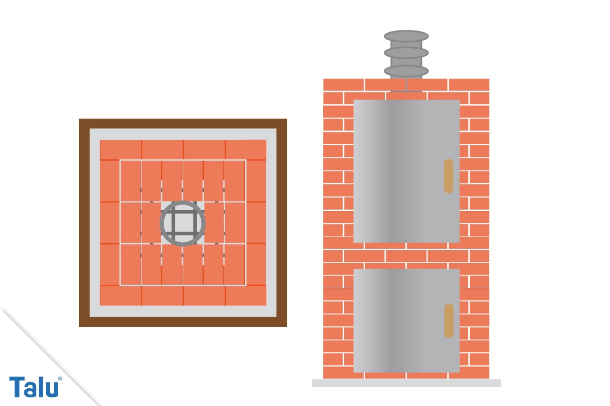 Anschließend wird er mit Türen aus Stahlblech ausgestattet. Diese werden mit dem Winkelschleifer passend geschnitten und mit Scharnieren versehen. Mit den Scharnieren wird die Tür am Mauerwerk verschraubt. Die Kanten der Bleche werden rund geschliffen, so kann sich niemand daran verletzen. Der Griff der Türen sollte jedoch aus Holz sein, sonst verbrennt man sich beim Öffnen die Finger.