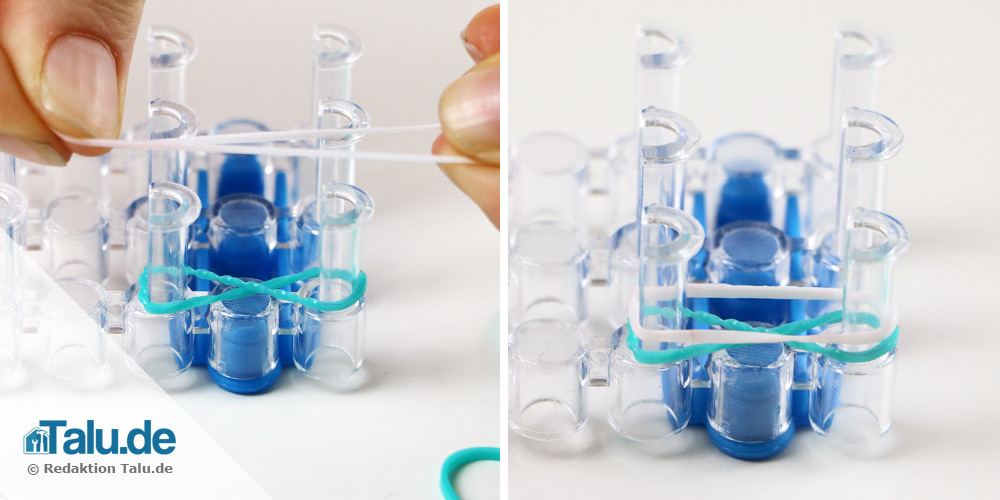 3. Schritt: Führen Sie anschließend das untere Gummibandpaar mit dem Haken nach oben und diagonal über den vorherigen Stift. Spannen Sie so alle anderen Looms bis zum Ende.