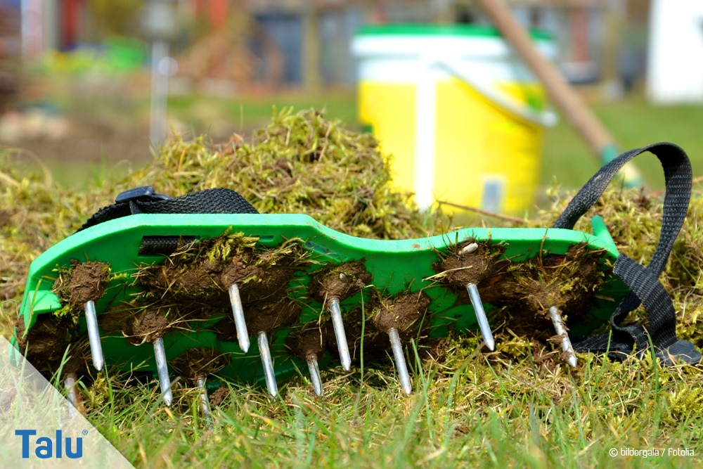 4. Rasenlüfter-Schuhe: dieses Schuhwerk ist mit fünf bis zehn Zentimeter langen Bodennägeln versehen, die durch die Laufbewegung in den Boden getrieben werden. Dieses Werkzeug ist nur für körperlich fitte Menschen zu empfehlen, da diese Arbeit schweißtreibend sein kann, vor allem bei großen oder stark verdichteten Rasenflächen. Die Kosten für die Anschaffung belaufen sich auf etwa 20 Euro pro Paar.