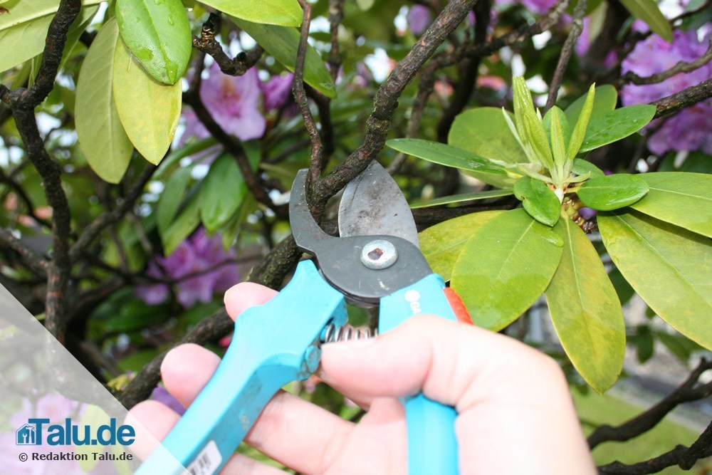 Der beste Zeitpunkt dafür liegt zwischen Ende Mai und Anfang Juni, nur wenige Hybriden blühen früher. Bei jüngeren Rhododendron müssen ohnehin die verwelkten Blüten ausgebrochen werden, denn die Pflanze steckt sonst mehr Kraft in Samenproduktion als in die Triebbildung. Die nichtblühenden Triebe können durch einen Schnitt wieder zur Verzweigung angeregt werden.