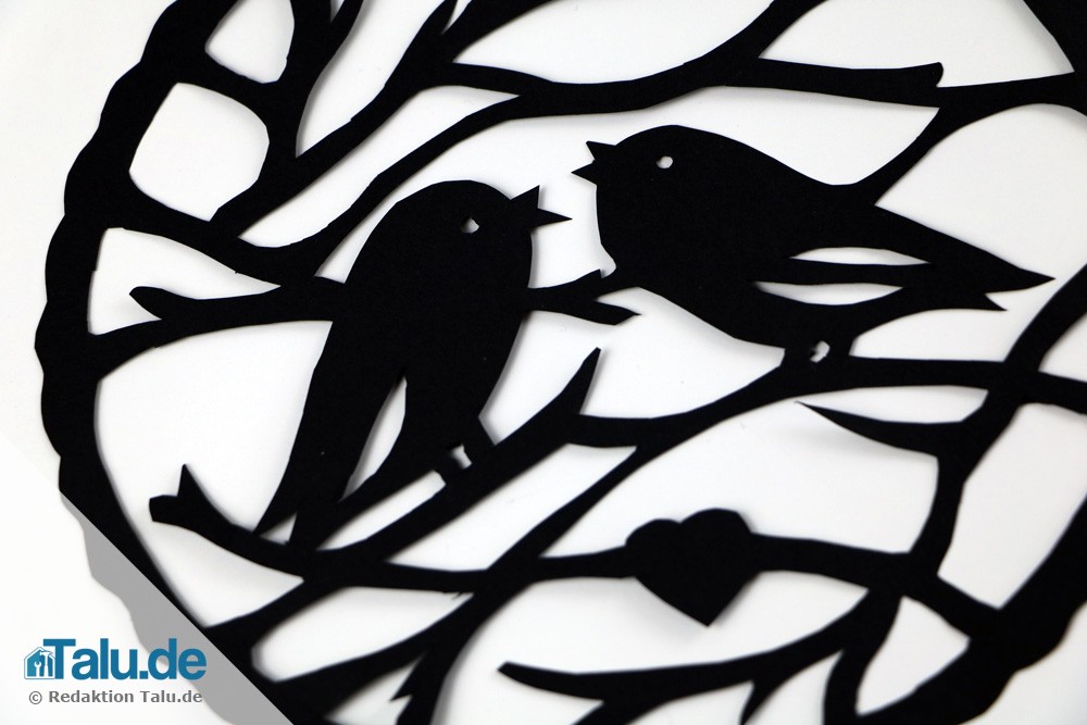 Nun ist unsere Vorlage oder Ihre eigenes Motiv ausgeschnitten. Jetzt können Sie diese direkt auf einen schwarzen Untergrund kleben und der Scherenschnitt ist bereits fertig. Dann muss das Motiv aber spiegelverkehrt aufgeklebt werden, da sonst die Umrisse der Vorlage zu sehen sind.