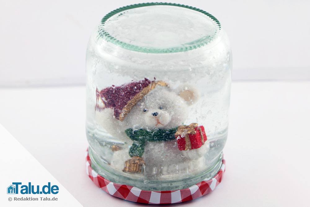 5. Schritt: Nun ergänzen Sie das Wasser. Bis zum Schraubrand lassen Sie etwa einen Zentimeter Abstand. Damit Ihr Schneegestöber später auch wirklich zum Boden rieselt und nicht etwa an der Wasseroberfläche schwimmt, fügen Sie anschließend einen Tropfen Spülmittel oder Glycerin hinzu.
