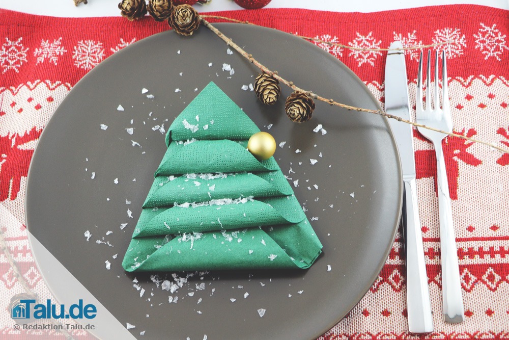 Der Tannenbaum als Symbol für die Lebenskraft gehört zu Weihnachten wie auch ein gutes Essen, Besinnlichkeit und natürlich auch Geschenke. So ist die Tannenbaum-Serviette bestens geeignet für die große Tafel. Die Serviette falten Sie blitzschnell und kinderleicht. Natürlich können Sie diese Falttechnik auch bei Stoffservietten anwenden, was der Tischdekoration dann noch mehr Schick verleihen würde.