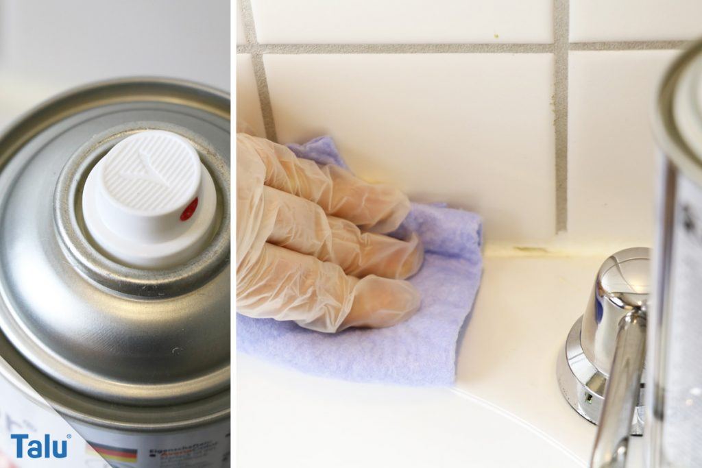 Beim Verfugen mit Silikon sollte immer auch der Entferner bereit stehen. Das Silikon lässt sich am einfachsten mit diesem Mittel entfernen, so lange es noch weich ist. Wenn es erst einmal ausgehärtet ist, wird das Entfernen von verschmierten Stellen immer schwieriger. Mit einigen Tricks kann man die Arbeit wesentlich sauberer und einfacher gestalten: Alle Fugen einfach mit Klebeband abdecken. Nachdem das Silikon ausgehärtet ist, zieht man das Klebeband einfach ab – fertig ist eine einwandfrei saubere Fuge. Silikonentferner ist auch bei diesem Verfahren sinnvoll: Vorher den Fliesenspiegel gründlich entfetten sorgt dafür, dass das Klebeband auf an Ort und Stelle bleibt.