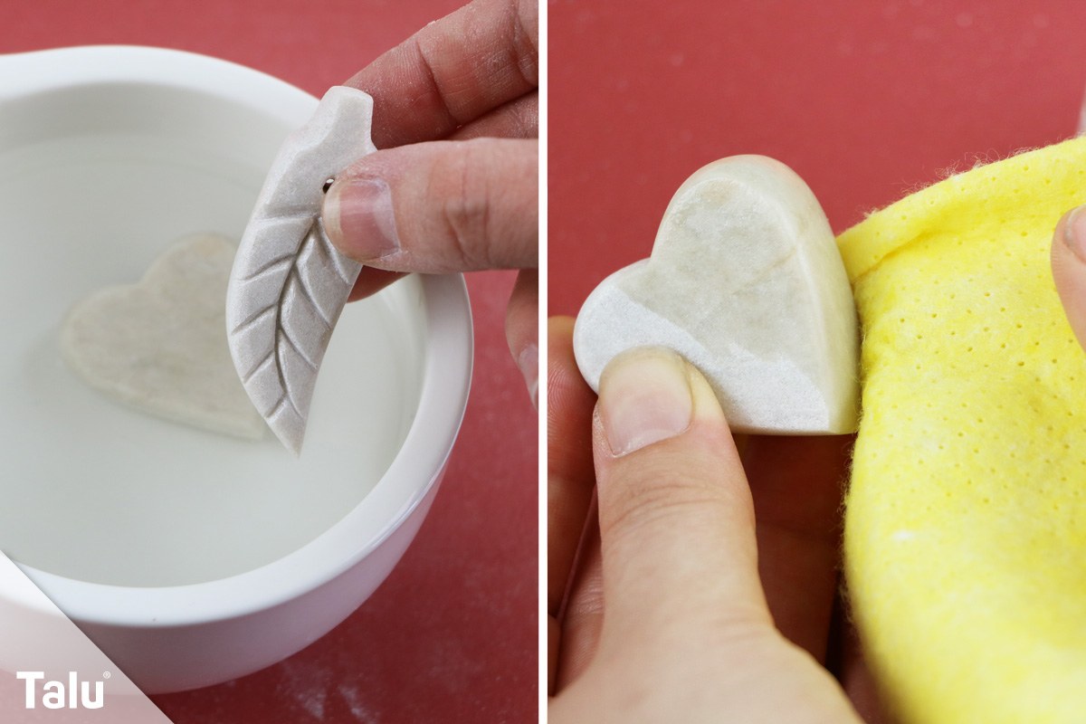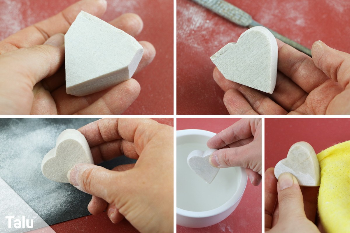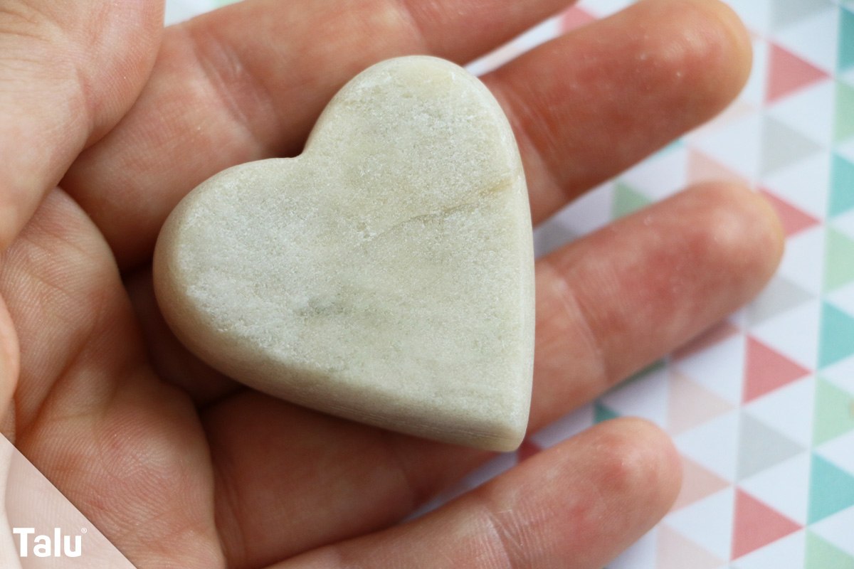 Das Herz hat eine dreieckige Form. Sägen Sie sich aus einem Stück Speckstein daher erst einmal ein gleichschenkliges Dreieck. Dieses wird nun rund geraspelt. Die typische Herzmitte können Sie mit einer runden Raspel sehr gut ausformen. Anschließend schleifen Sie die Oberfläche glatt. Das Speckstein-Herz wird nun in Wasser getaucht und anschließend mit Öl poliert.