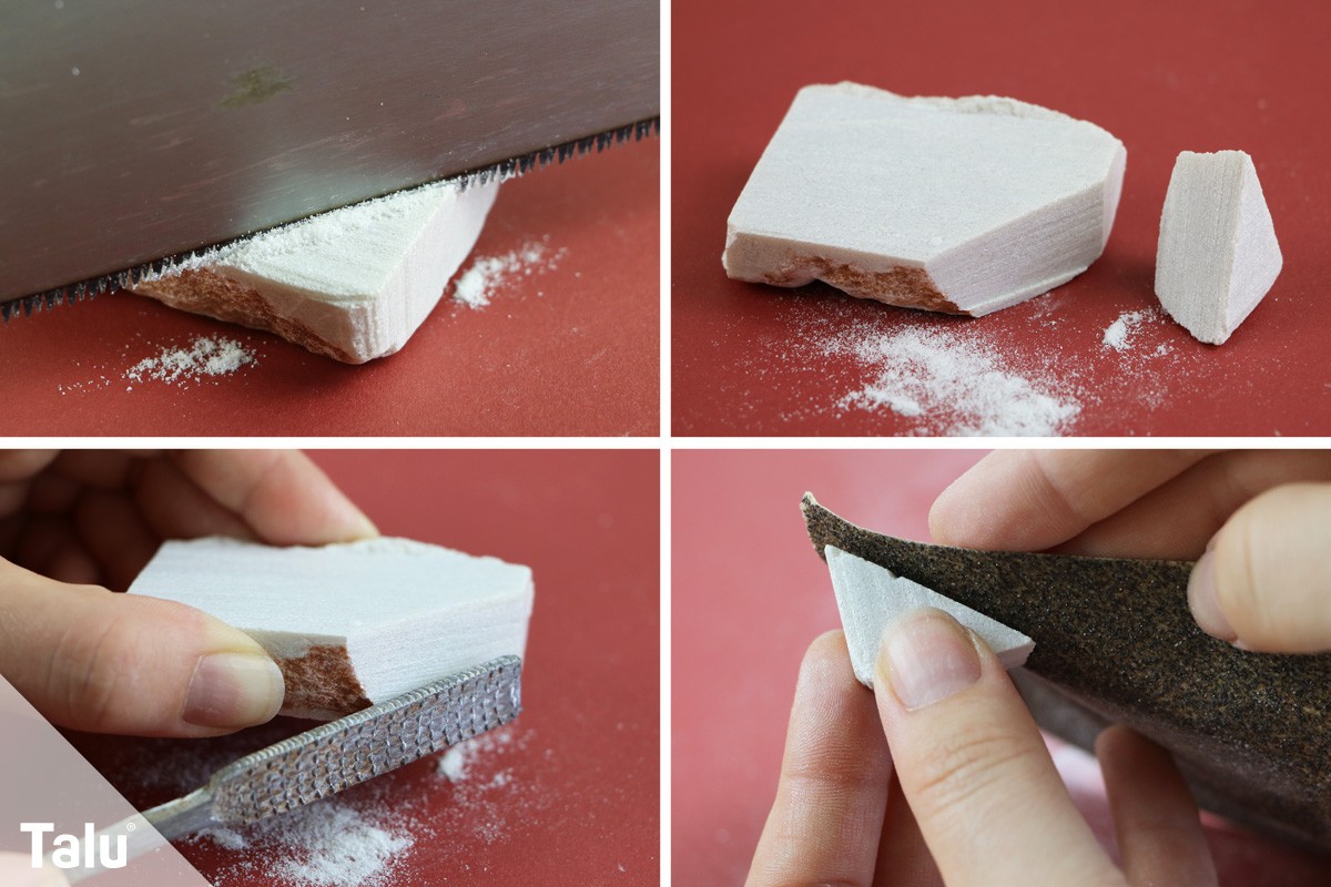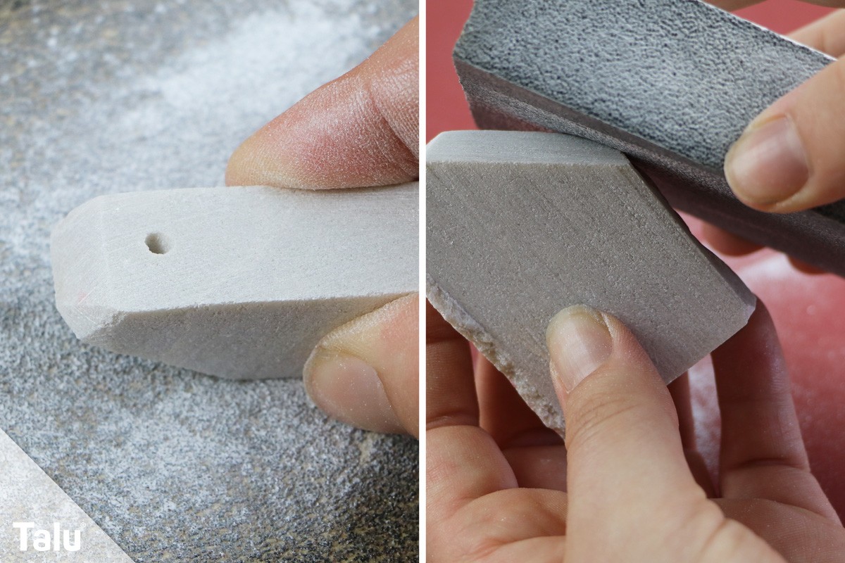 Haben Sie das Raspeln hinter sich gebracht und hat der Stein nun die gewünschte Form, wird die Oberfläche geglättet. Dabei reiben Sie gleichmäßig mit feinem Schleifpapier (K120) oder einem Schleifschwamm über den Stein. So entfernen Sie Kratzer, Risse, Unebenheiten und kleine Löcher, die beim groben Bearbeiten entstanden sind.