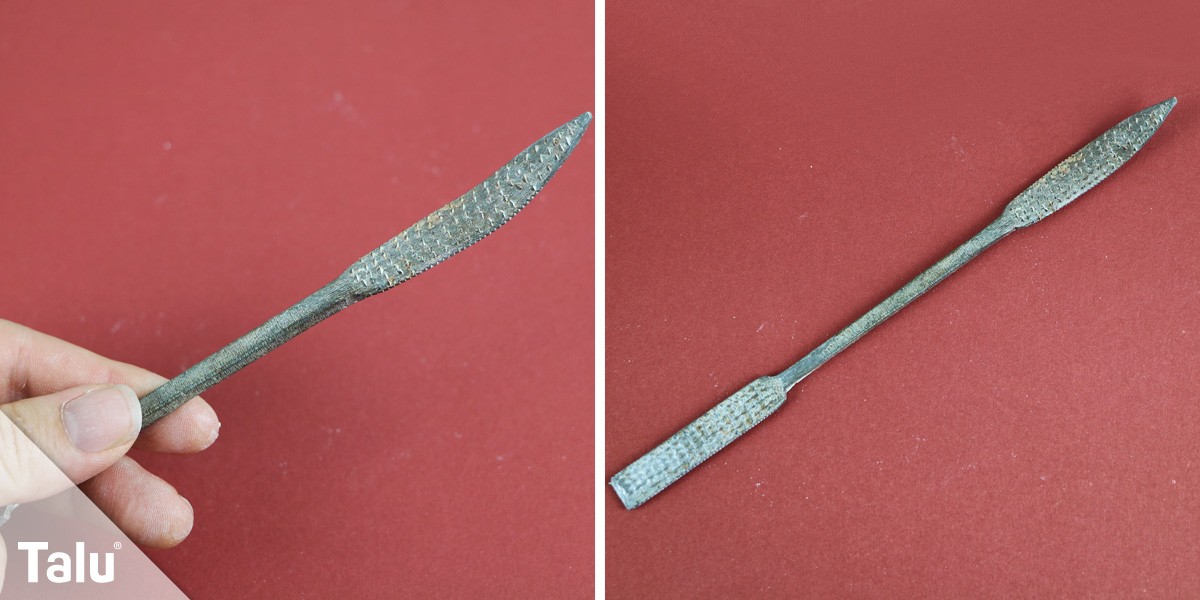 Zu Beginn muss der Speckstein grob in die Form gebracht werden, die er letztlich einmal haben soll. Ob nun Herz, Katze oder Schale – mit einer groben Specksteinraspel oder gröberen Schleifpapier (K60) gelingt das Formen am besten und am schnellsten.