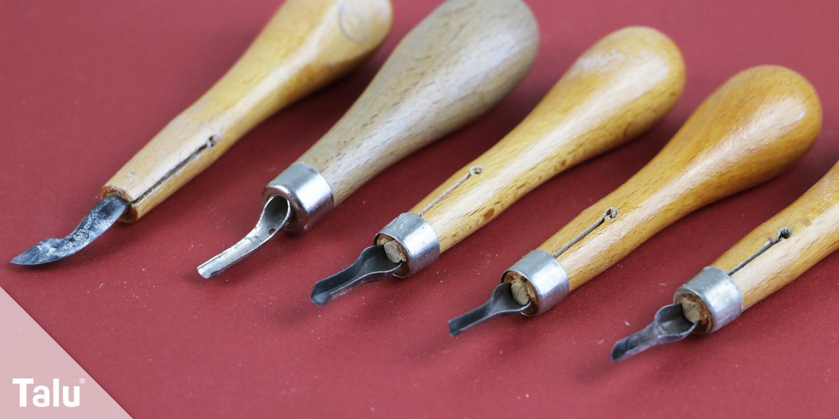Diese metallenen Schnitzwerkzeuge sind für filigrane Arbeiten gedacht. Die Köpfe gibt es in den unterschiedlichsten Ausführungen – rund, eckig, dreieckig, oval und als kleines Schabmesser. Mit dem Holzgriff liegen diese Werkzeuge gut in der Hand. Die Geräte werden auch für Holzschnitzereien verwendet.