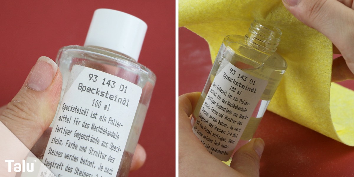 Nun wird der Speckstein auf Hochglanz poliert. Bevor Sie mit dem Specksteinöl hantieren, entfernen Sie die Staubschicht mit Wasser. Bereits im nassen Zustand glänzt der Speckstein wie Marmor. Im Wasser kann man den Stein nun auch noch mit Wasserschleifpapier (K360 bis K500 oder K1200) weiter glätten. Nachdem der Stein durchgetrocknet ist, wird er poliert. Dafür können Sie Naturharzöl verwenden – geben Sie ein paar Tropfen auf einen Lappen oder ein Tuch und reiben Sie die Specksteinfigur damit ein.