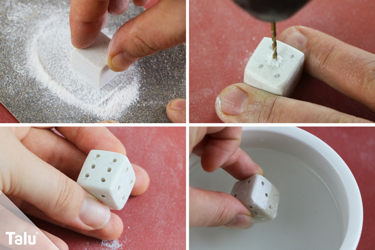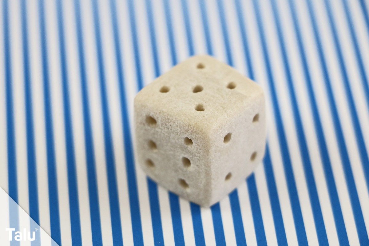 Der Würfel für die Spieler unter Ihnen ist ebenso kinderleicht. Zuerst sägen Sie ein gleichmäßigen Würfel aus dem Speckstein zurecht. Anschließend glätten Sie die Seiten schon einmal mit Schmirgelpapier vor. Danach nehmen Sie einen Bleistift und malen die Würfelaugen auf allen sechs Seiten vor. Mit einem Handbohrer oder einer Bohrmaschine bohren Sie nun die einzelnen Augen in den Speckstein – Achtung! bohren Sie nicht zu tief! Danach folgt die Veredelung. Reinigen Sie den Stein mit Wasser und polieren Sie diesen dann mit Specksteinöl.