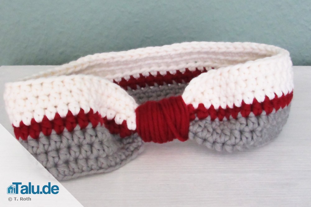 Wenn Ihr Stirnband die gewünschte Breite erlangt hat und Sie die letzte Reihe mit einer Kettenmasche beendet haben, können Sie bei Bedarf noch ein Highlight setzen. Schneiden Sie dazu den Faden nicht direkt an der letzten Masche ab, sondern erst nach circa einem halben Meter Länge. Ziehen Sie diesen Restfaden nun durch die letzte Masche komplett hindurch. Knautschen Sie das Stirnband mit den Ihren Fingern ein wenig zusammen und wickeln Sie den Faden mehrmals um das Stirnband herum. Vernähen Sie anschließend den Rest des Fadens und schneiden Sie den Überrest mit der Schere ab. Falls Sie mehrere Farben verwendet haben, achten Sie darauf, alle anderen Fäden zu vernähen, bevor Sie den Faden um das Stirnband herumwickeln.