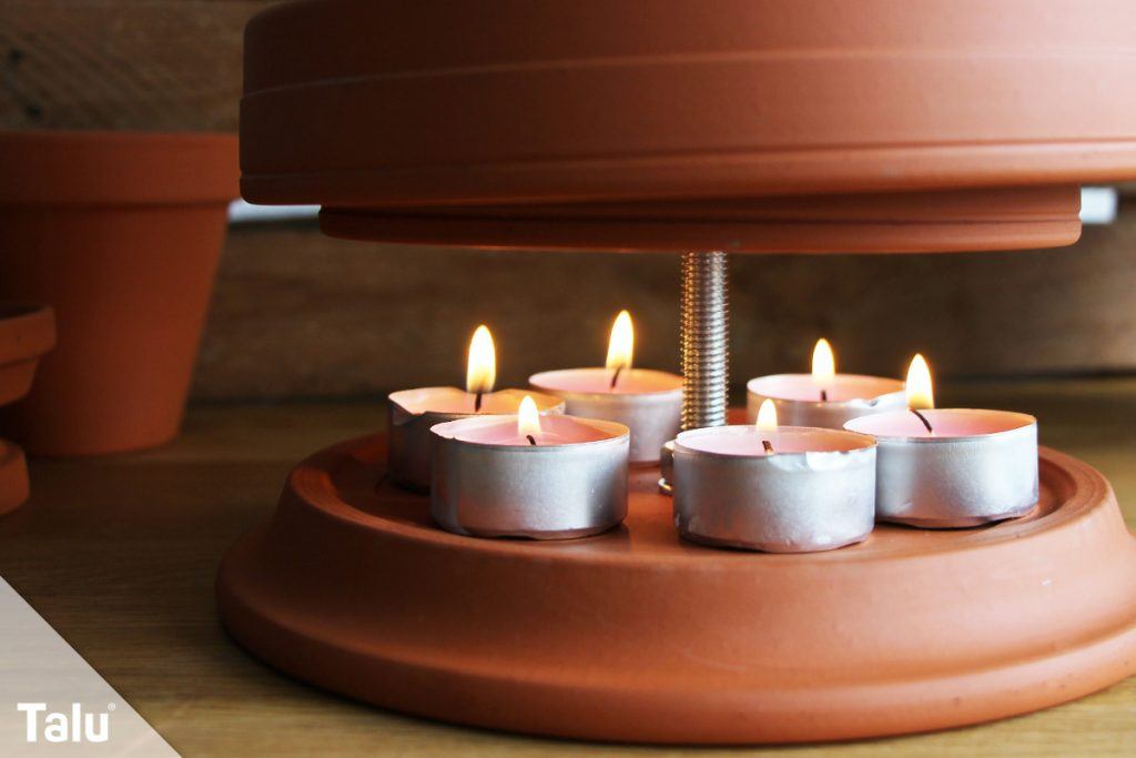Die Teelichter werden nun auf den Untersetzer gestellt und angezündet. Wenn Sie die Tontöpfe etwas höher an der Stange platzieren, können Sie Teelichter auch in kleinen Gläsern darunter aufgestellt werden. Dabei geht aber Wärme verloren.