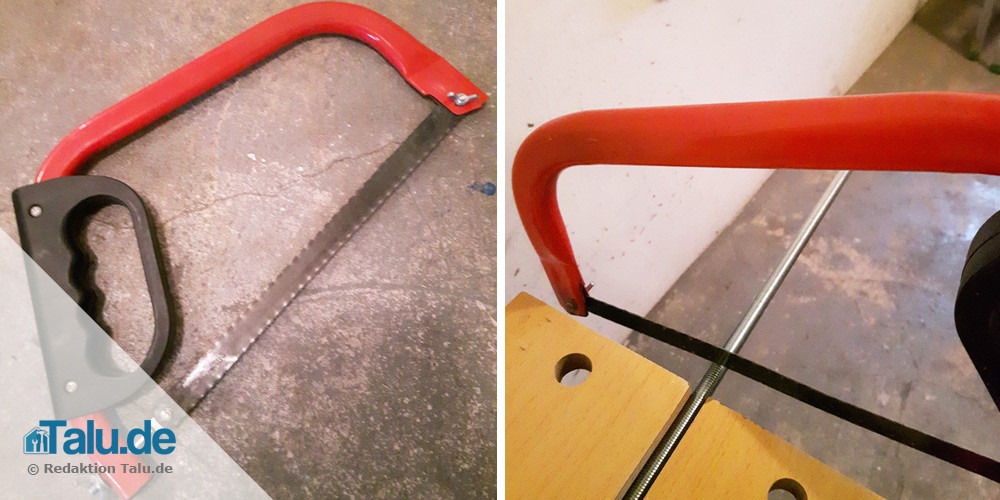 2. Schritt: Schieben Sie durch das Loch im Untersetzer die Gewindestange. Diese gibt es oft nur mit 1 m oder 15 cm Länge zu kaufen. Mit einer Metallsäge können Sie die Stange aber ganz leicht durchsägen. Wir haben die Stange auf 30 cm zugesägt. So hat man am Ende noch etwas Spielraum bei der Höhe. An der jeder Seite wird eine Unterlegscheibe mit einer Mutter angebracht und festgedreht.