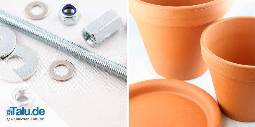 im Schritt 2 haben wir erklärt, wie und auf welche Länge die Gewindestange zugesägt werden muss. Die Stange sollte etwa 30 cm lang sein, so haben Sie noch genug Spielraum für die Platzierung der Tontöpfe.