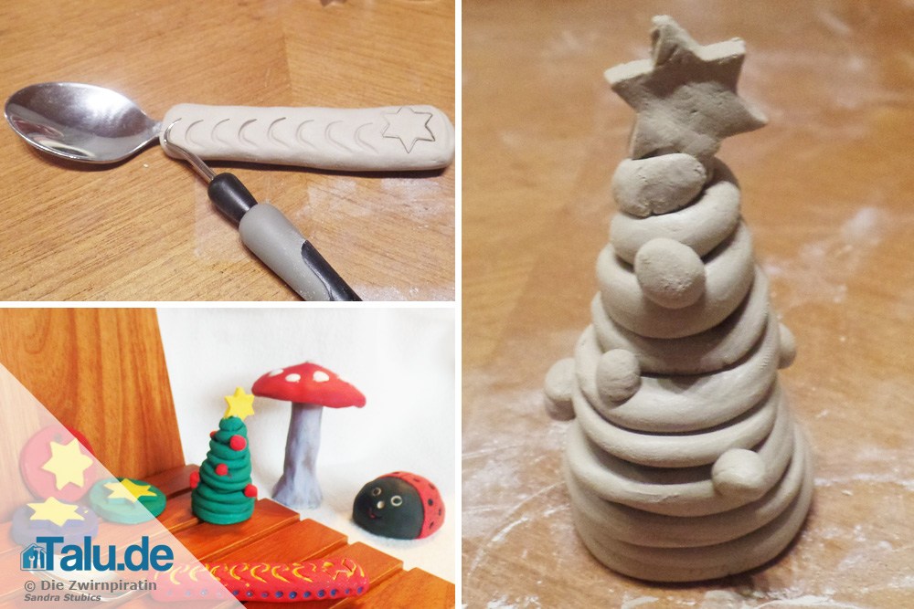 Ob als Baumschmuck oder als Deko im Fenster oder an der Tür: Aufhänger bringen Weihnachtliche Stimmung ins Haus. Hier noch eine ganz schnelle Anleitung zum Töpfern, die auch Kleinkinder mühelos schaffen: Walken Sie die Modelliermasse zu einer Fläche mit etwa 3mm Höhe. Stechen Sie jeweils eine Grundform (im Bild der Kreis) und eine etwas kleinere Dekoform (im Bild der Stern) aus. Befestigen Sie den Stern mit etwas Wasser auf dem Kreis. Zu guter Letzt stechen Sie mit einem Strohhalm oder einem anderen Hilfsmittel Ihrer Wahl ein Loch in jene Seite, die später oben sein soll. Diese Aufhänger können nun noch nach Lust und Laune verziert werden. Somit ist auch unser sechstes Motiv fertig.