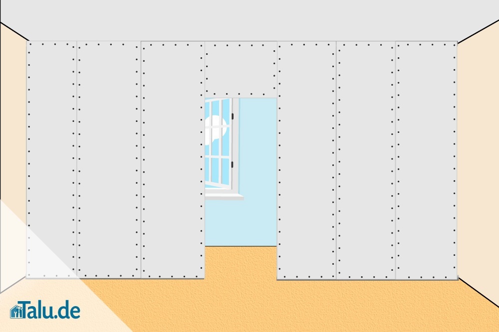 Als Beispiel eines Aufbaus einer Trockenbauwand dient eine Trennwand mit Tür.