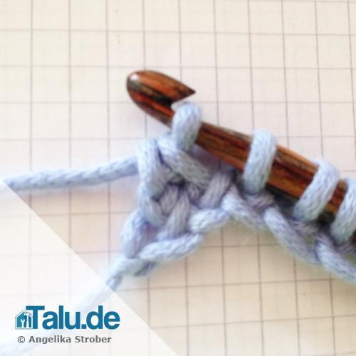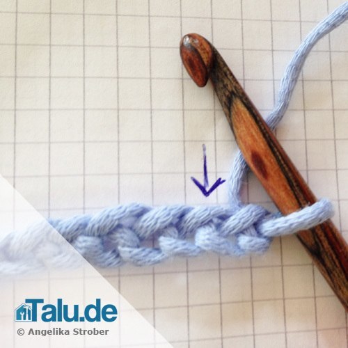 In dieser ersten Reihe und allen weiteren ungeraden Reihen holt man alle Maschen auf die Nadel. Erste Einstichstelle ist die zweite Luftmasche von der Nadel aus gesehen. Durch diese Masche hindurchstechen und den Faden durchziehen. Es liegen nun zwei Schlaufen auf der Nadel: die Endmasche der Luftmaschenkette und die gerade durchgezogene Schlaufe.