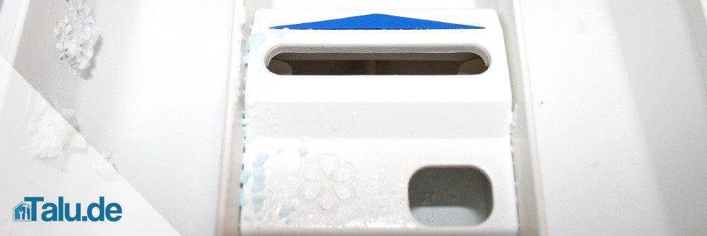 Das Waschmittelfach mit den Waschmittelresten kann mit der Zeit richtig schlimm aussehen. Schwarze Beläge, Waschmittelreste, die verkrusten und sich verfärben, müssen regelmäßig entfernt werden. Essigwasser oder Essigreiniger leisten da gute Dienste. Die Fächer lassen sich meist gut auseinandernehmen. Das ist günstig, denn so können die Teile besser gereinigt werden. Man weicht sie im Putzwasser ein und nach ein paar Minuten lässt sich die Verschmutzung gut ablösen. Am Ende die Teile mit klarem Wasser abspülen und wieder einbauen.