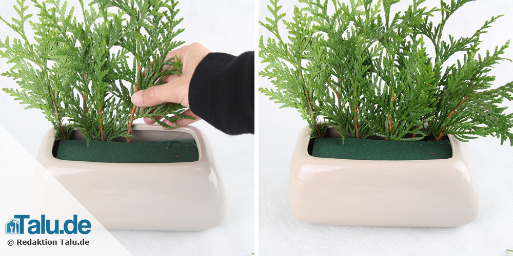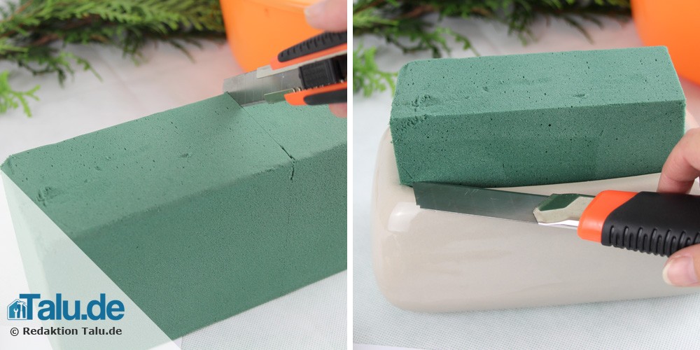 Schieben Sie den nassen Steckschwamm ins Gefäß. Dabei sollten ein paar Zentimeter des Schwamms über den Topf hinausragen. Steht zu viel Schwamm über, können Sie ihn mit einem Messer zuschneiden. Mit den abgeschnittenen Stücken verkeilen Sie den Steckschwamm so im Gefäß, dass er absolut fest sitzt.