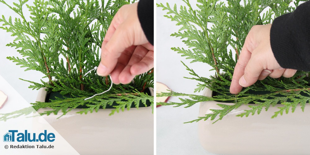 6. Anschließend die Zapfen, Baumrinde und Zimtstangen mit Draht anbringen. Die Efeuranke über das Weihnachtsgesteck legen.