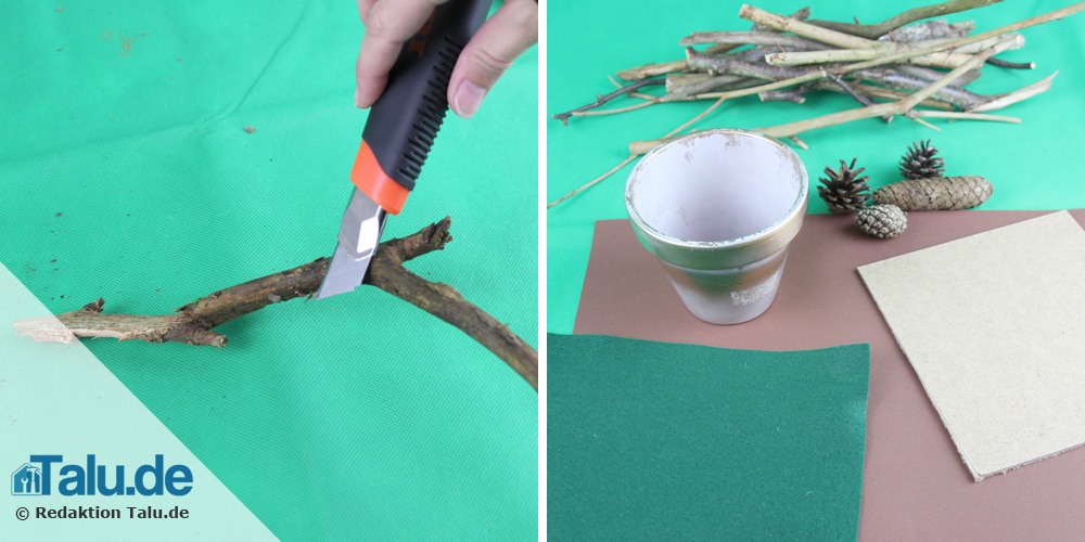 Schritt 1 – Begeben Sie sich auf einen ausgedehnten Streifzug durch ein nahegelegenes Naturgebiet und sammeln Sie kleine Aststöckchen und ansprechende Holzverwachsungen sowie Lärchenzäpfchen.