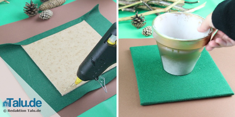 Schritt 4 – Greifen Sie zum quadratischen Holzbrett. Es bildet die Basis Ihres Weihnachtsgestecks. Bevor Sie die Stöckchen und Äste befestigen, nehmen Sie Maß, wie viel Platz ihr gewählter Kerzenhalter benötigt. Wir verwenden einen winterlich gestalteten Tontopf. Leimen Sie anschließend die vorbereiteten Aststöckchen und Holzverwachsungen auf das Brett. Mit Heißkleber funktioniert dies am besten. Schieben Sie die einzelnen Teile in- und übereinander – ganz so, wie es Ihnen gefällt.