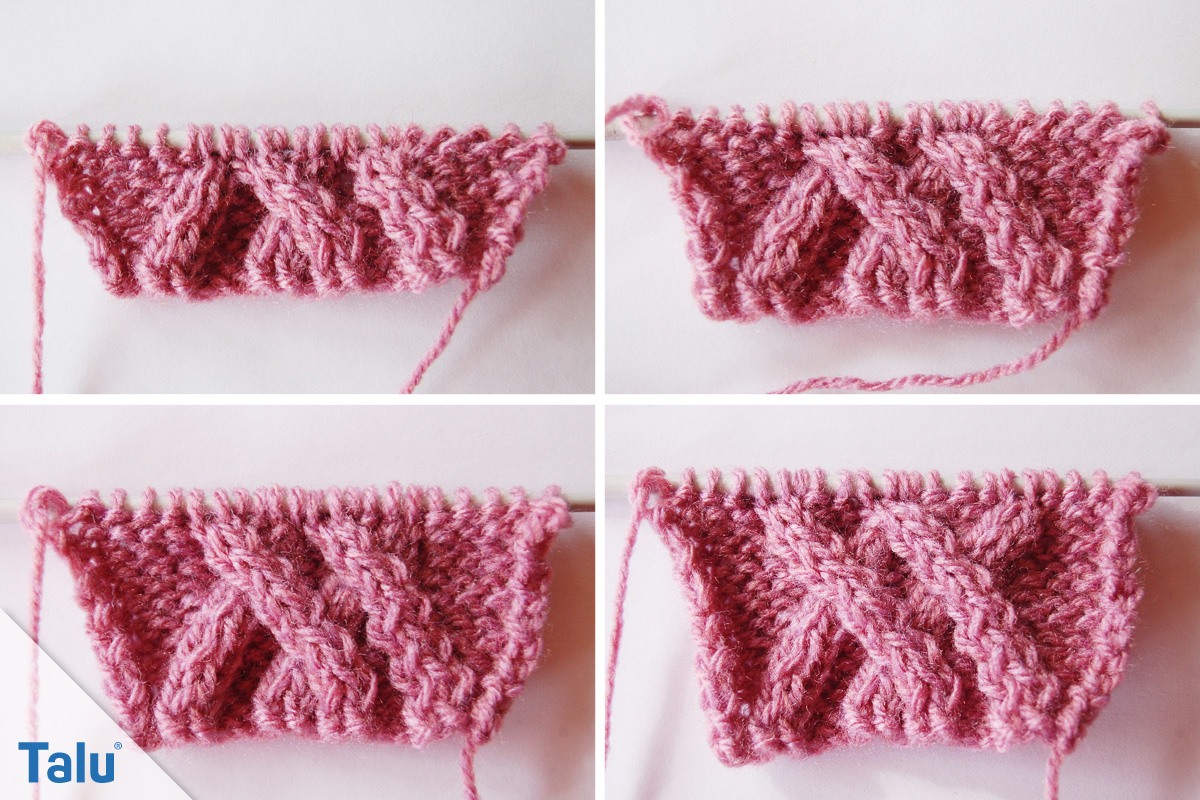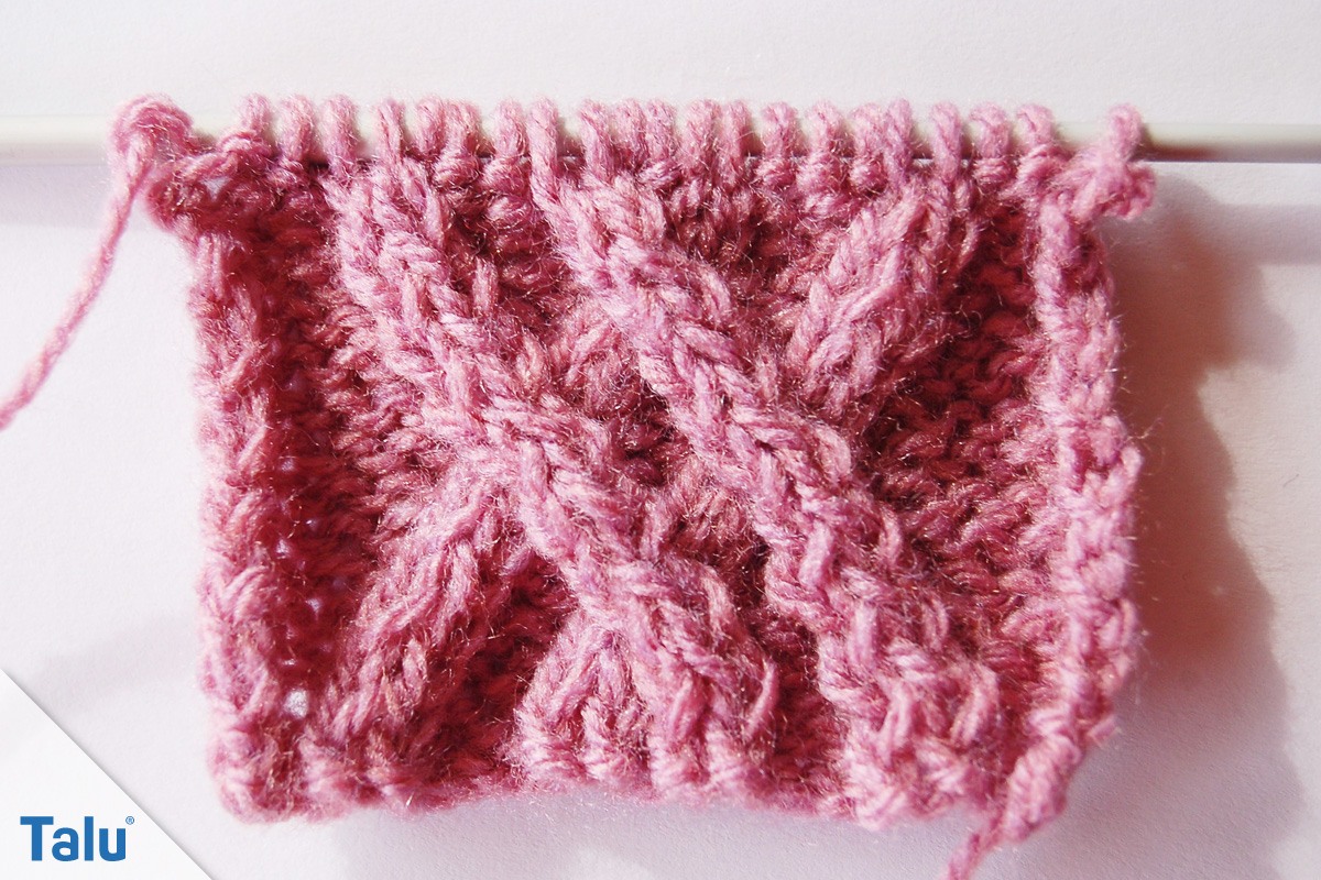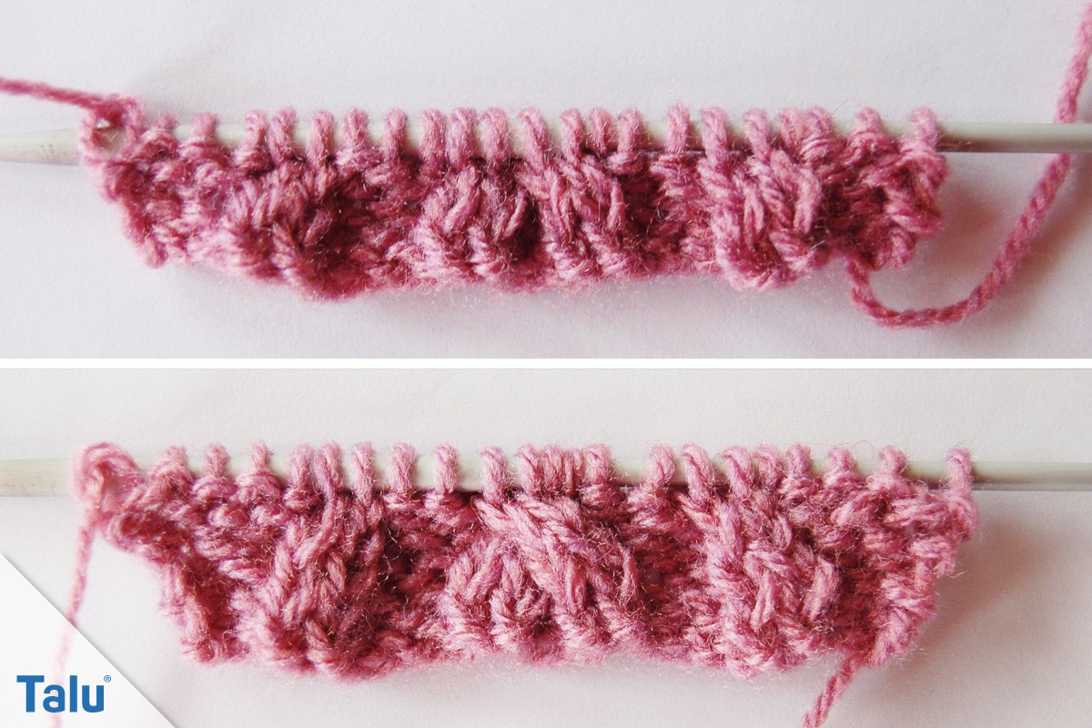3. Reihe: 2 Maschen auf die Hilfsnadel vor die Arbeit legen, 1 Masche links, die Maschen von der Hilfsnadel rechts, 2 Maschen links, 2 Maschen auf die Hilfsnadel vor die Arbeit legen, 1 Masche links, die Maschen von der Hilfsnadel rechts, 1 Masche auf die Hilfsnadel hinter die Arbeit legen, 2 Maschen rechts, die Masche von der Hilfsnadel links, 2 Maschen links, 1 Masche auf die Hilfsnadel hinter die Arbeit legen, 2 Maschen rechts, die Masche von der Hilfsnadel links