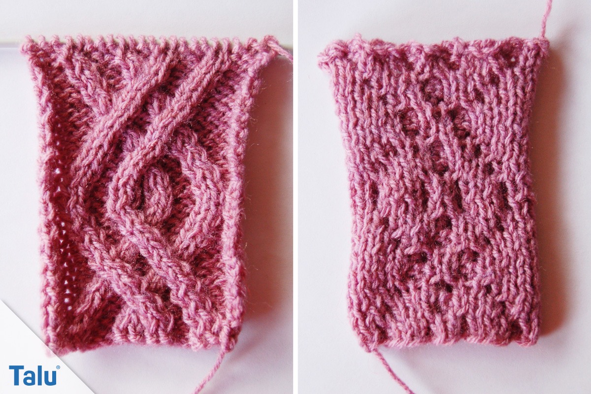 5. Reihe: 1 Masche links, 2 Maschen auf die Hilfsnadel vor die Arbeit legen, 1 Masche links, die Maschen von der Hilfsnadel rechts, 2 Maschen links, 2 Maschen auf die Hilfsnadel vor die Arbeit legen, 2 Maschen rechts, die Maschen von der Hilfsnadel rechts, 2 Maschen links, 1 Masche auf die Hilfsnadel hinter die Arbeit legen, 2 Maschen rechts, die Masche von der Hilfsnadel links, 1 Masche links