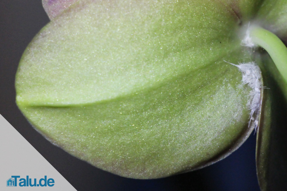 - Auf den Blättern, Blüten und in den Blattachseln erscheinen wattige Bäusche und weißliche Gespinste