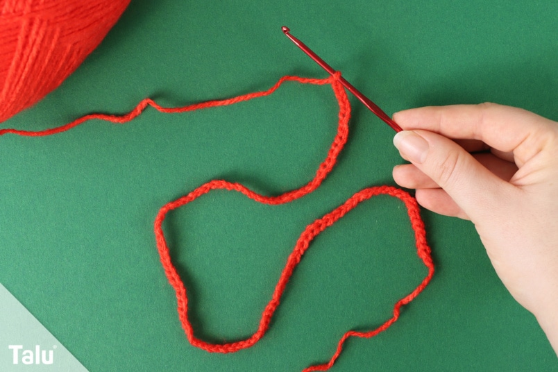 2. Schritt: Häkeln Sie jetzt 100 Luftmaschen. Mit dieser Länge wird die Zuckerstange später ca. 20 cm groß. Je nach Stärke der Wolle wird diese Länge unterschiedlich ausfallen. Daher ist wichtig, dass sie für weiß und rot dasselbe Garn verwenden.